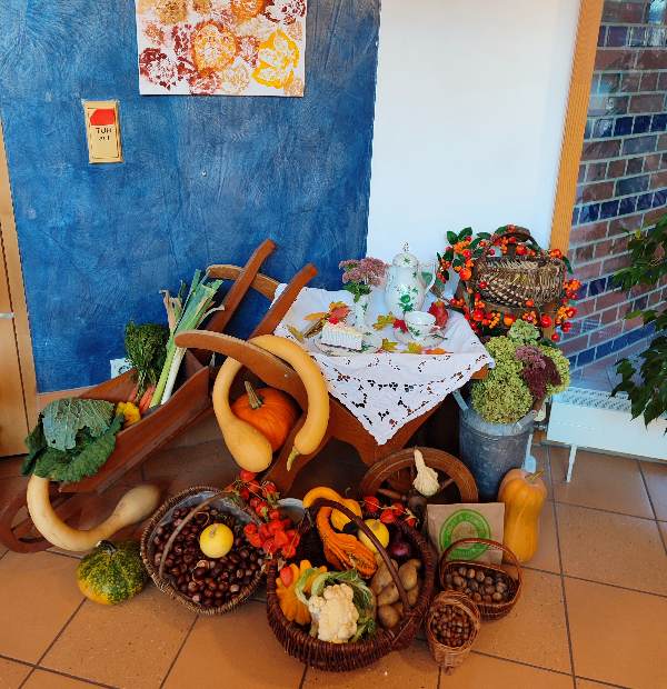 Seit vielen Jahren kommen die Landfrauen in der Erntedankzeit ins Haus, um mit ihrer Dekoration Freude zu schenken. Bewohner/-innen, Angehörige und Mitarbeitende wissen diesen Einsatz zu schätzen.